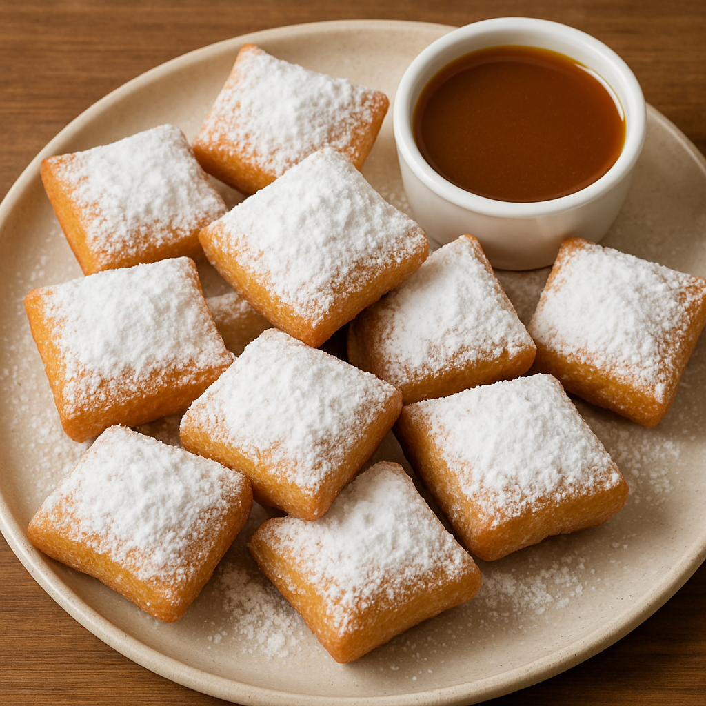 Beignets made from scratch topped with powered sugar and includes a complimentary maple syrup and caramel dipping sauce